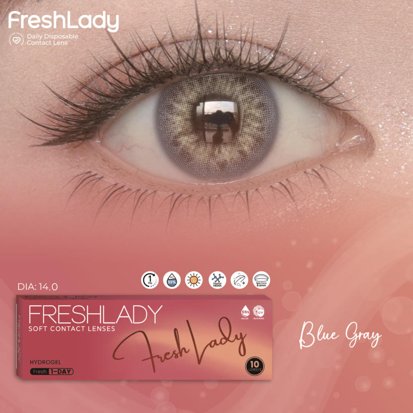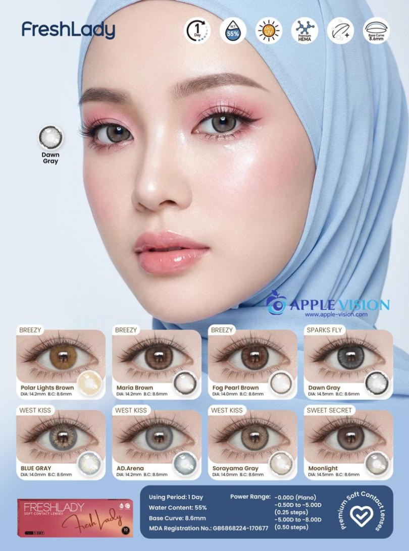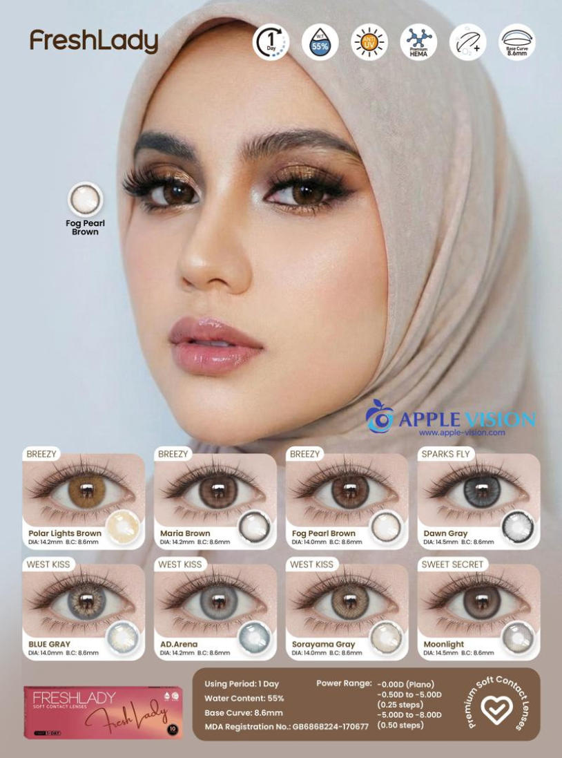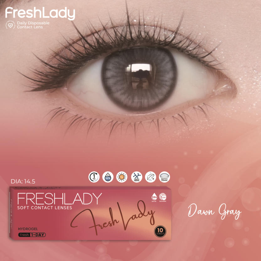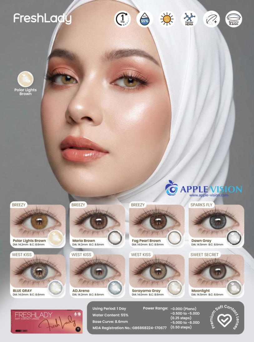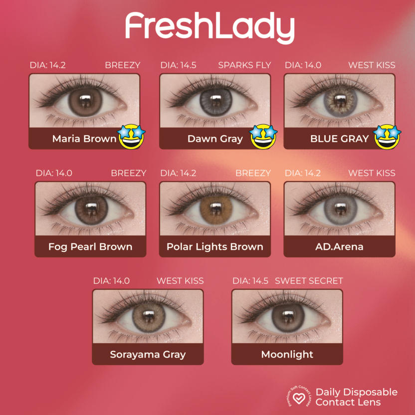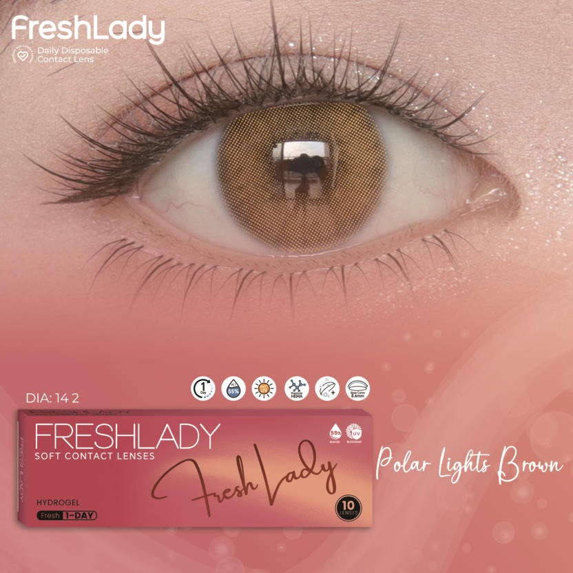 FreshLadyPolar Light Brown , Maria Brown, Fog Peal Brown, Dawn Gray, Blue Gray, AD.Arena, Sorayama Gray, MoonlightDAILY DISPOSABLE SOFT CONTACT LENS10 LENSES PER BOX55% UV H2O0.080 +- 0.020 @ -3.00 D8.6MM14.0, 14.2, 14.5MMPlano0.50 to -5.00 D (0.25 D)-5.50 to -8.00 D (0.50 D)