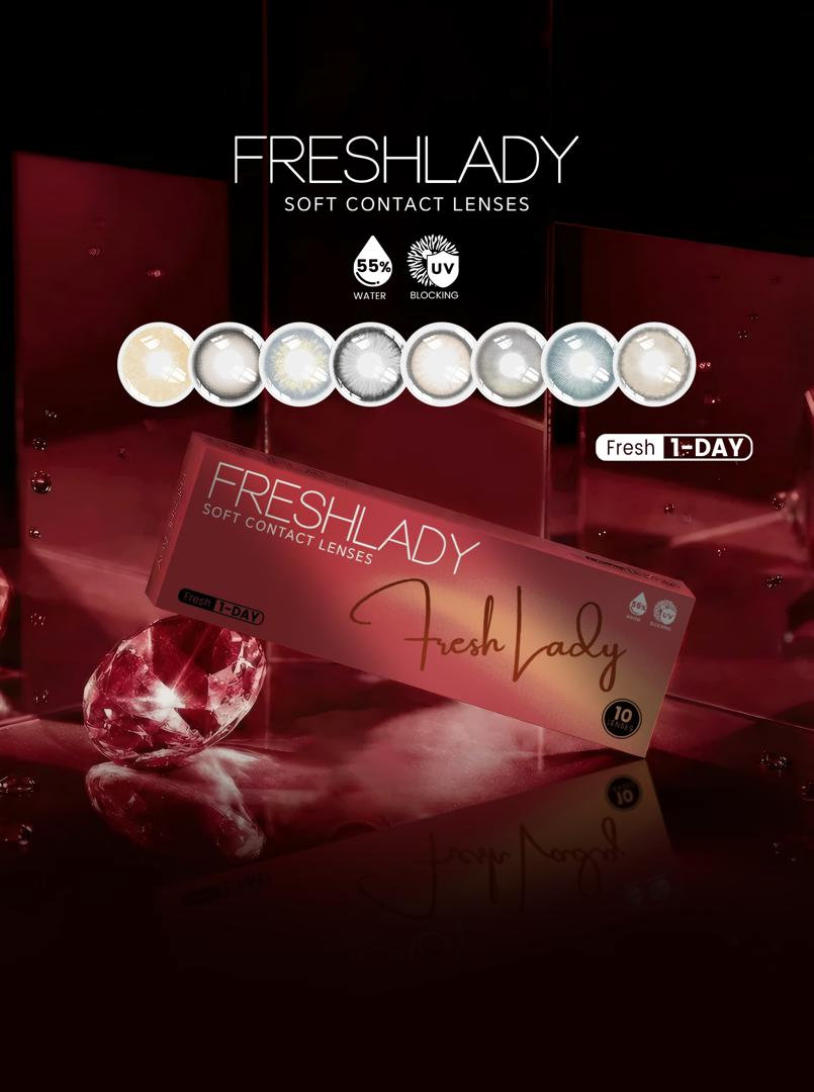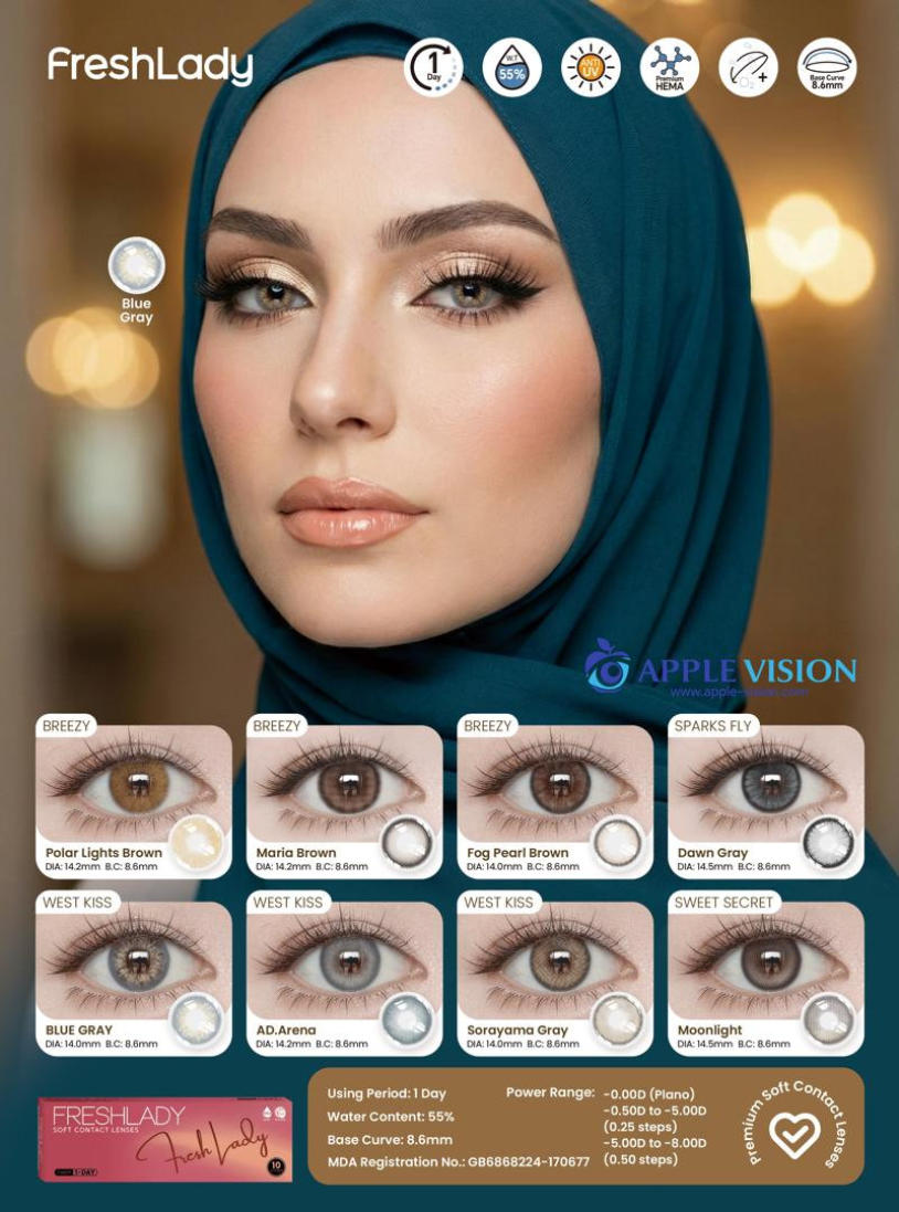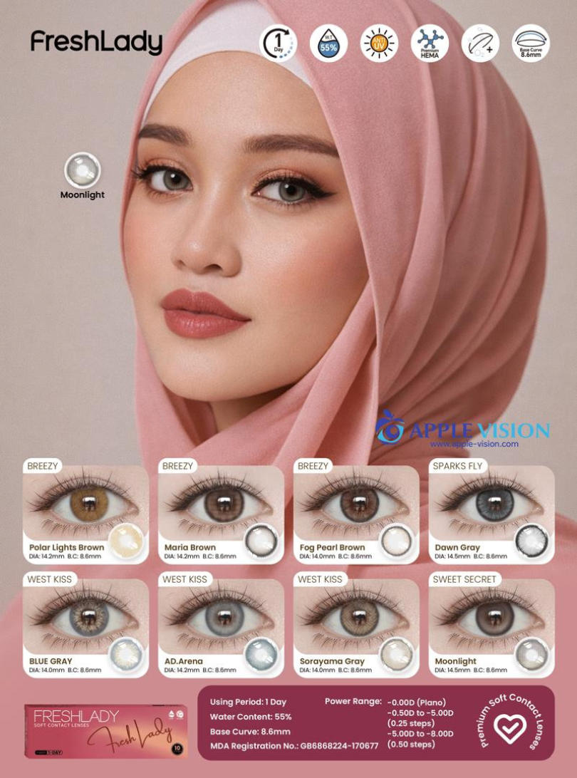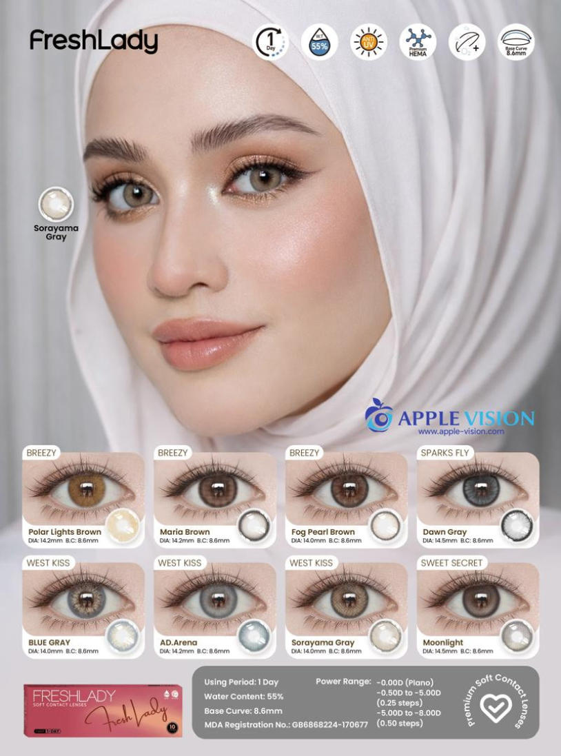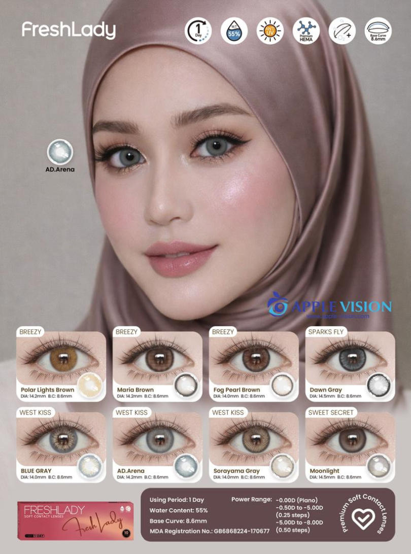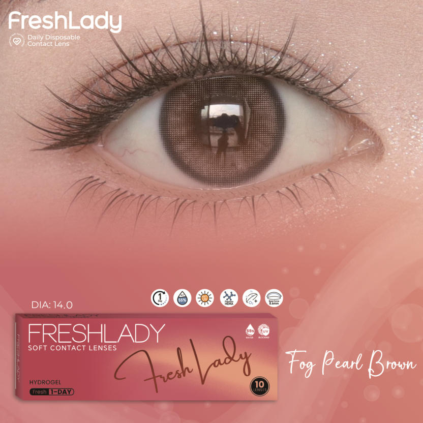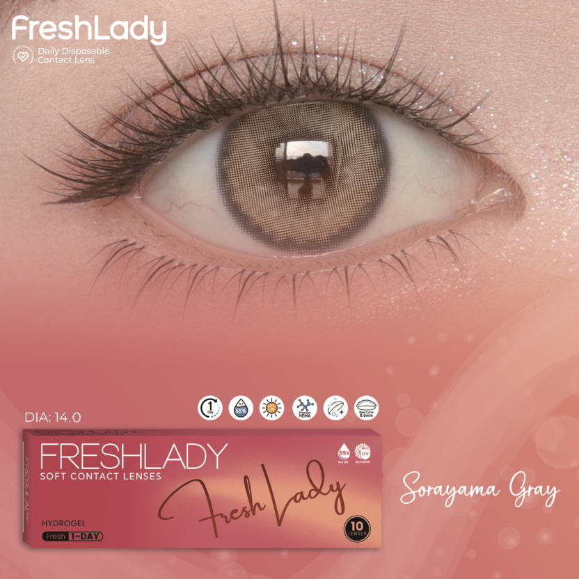 FreshLadyPolar Light Brown , Maria Brown, Fog Peal Brown, Dawn Gray, Blue Gray, AD.Arena, Sorayama Gray, MoonlightDAILY DISPOSABLE SOFT CONTACT LENS10 LENSES PER BOX55% UV H2O0.080 +- 0.020 @ -3.00 D8.6MM14.0, 14.2, 14.5MMPlano0.50 to -5.00 D (0.25 D)-5.50 to -8.00 D (0.50 D)